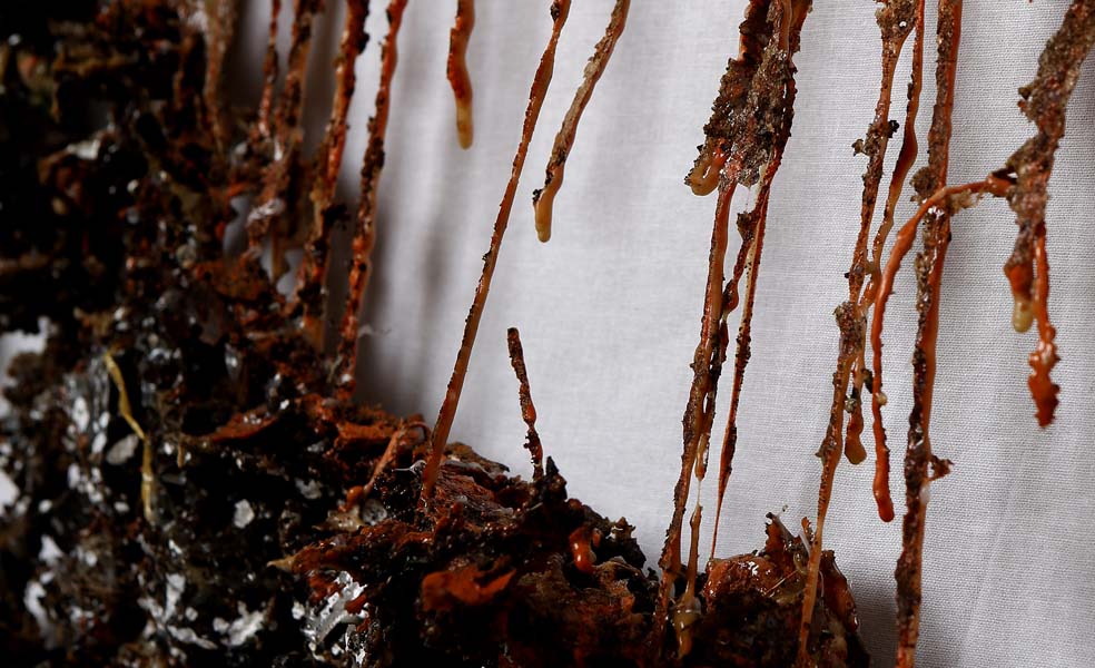 memories xi a series in progress latex, canvas, rotring ink, stone and other organic matter 9.4 ft x 4.2 ft 2014 ← Previous ProjectNext Project →